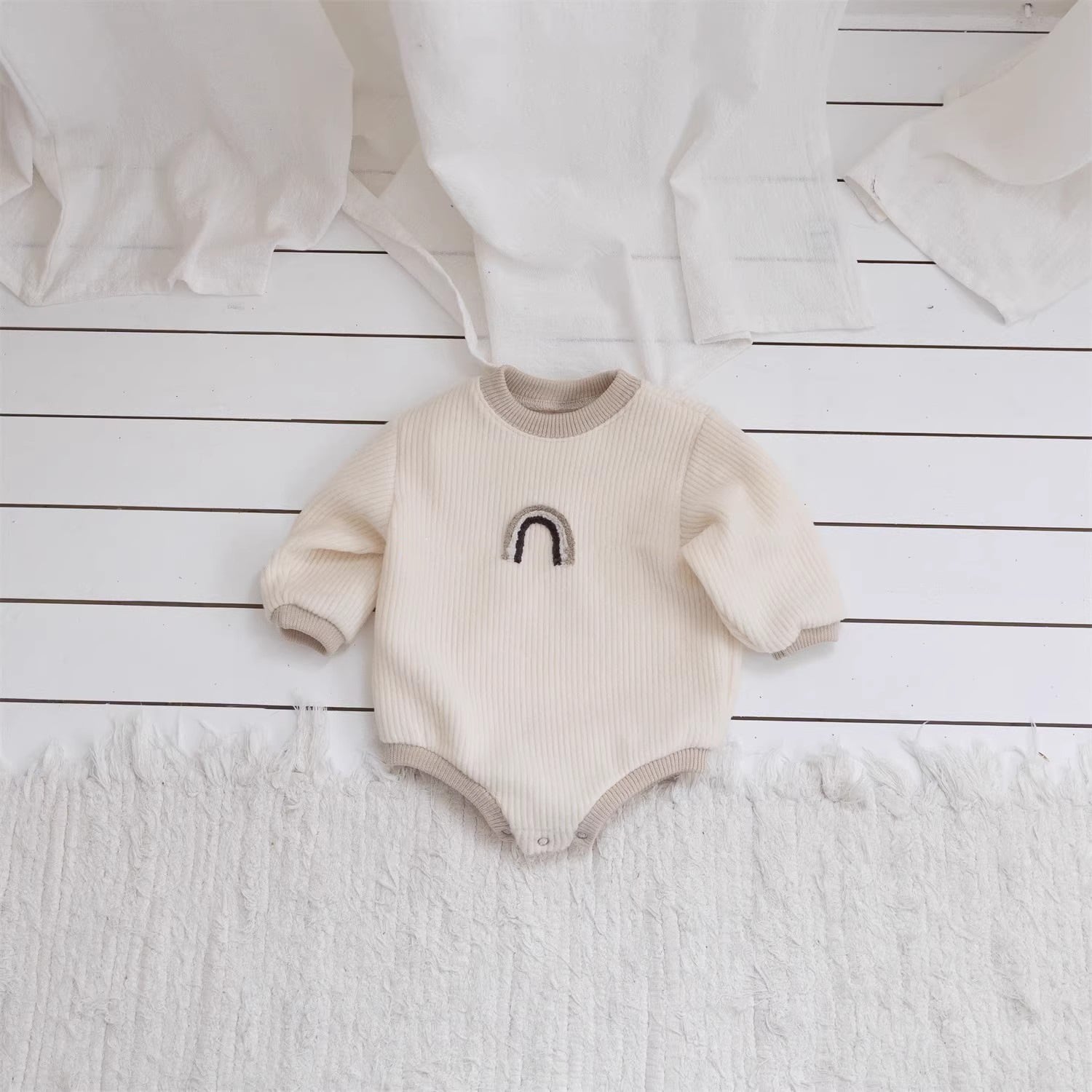 ベビー 冬新作 刺繍 レインボー柄 長袖 ロンパース
