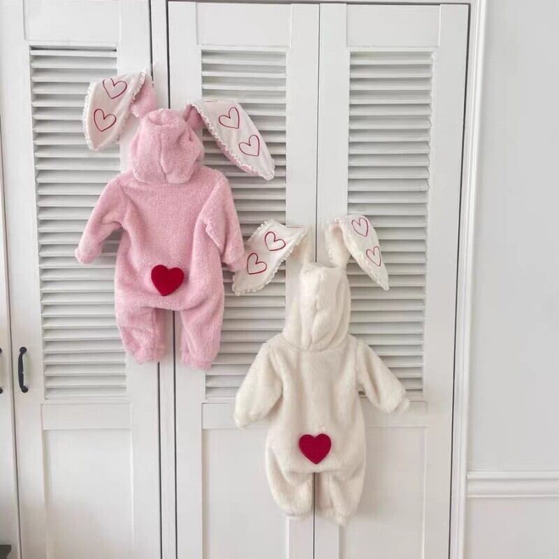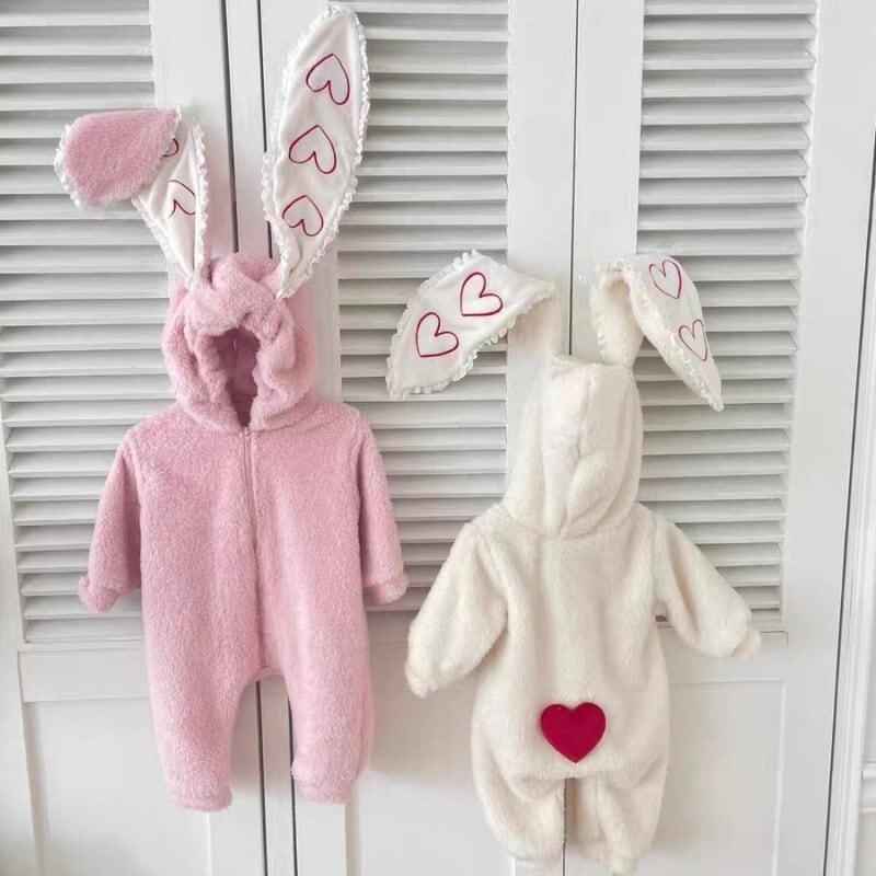 ベビー 冬新作 ボア 裏起毛 厚手 うさぎ耳付き ロンパースアウター