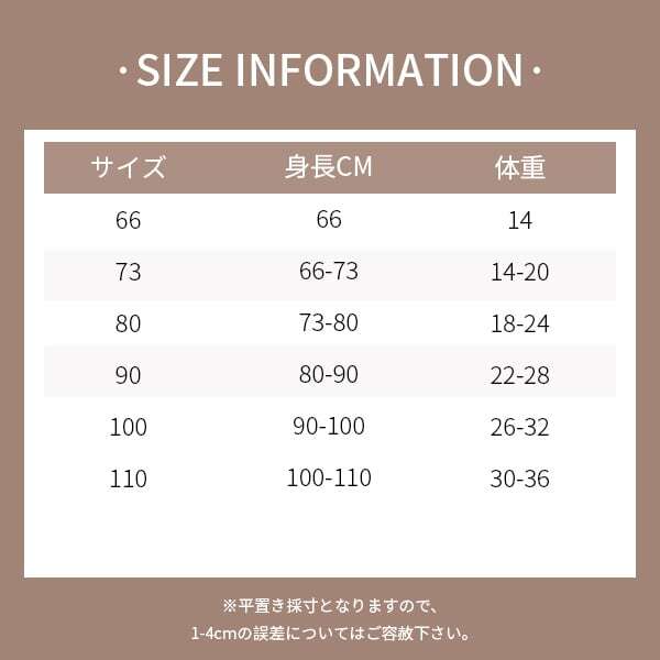 サイズ展開:73,80,90,100,110,120 カラー:クリーム,ベージュ,コーヒー色 <ご注文前に必ずご利用ガイド/SHOPPING GUIDEをお読みください> 〇当店は海外に在庫があり、在庫の変動が激しいため、商品を発送するまで5~14営業日ほど頂いております。お時間に余裕をもってご注文下さい。ご注文が集中した場合や、発送業務または海外の祝休日の都合により発送が遅れることもございます。予めご了承下さい。 〇ご注文後のキャンセルと変更、発送後のご返品およびご交換は承りかねます。(商品不良の場合を除く) 〇表示されているサイズの一部は売り切れて入荷がない場合もございます。入荷の有無についてはお問い合わせいただいても回答出来かねますので、ご了承ください。 〇同じ商品でも色によって定価販売と割引価格販売が混在する場合があります。 〇照明の関係により、実際よりも色味が違って見える場合があります。 またパソコン、スマートフォンなどの環境により、若干製品と画像のカラーが異なる場合もございます。予めご了承ください。 〇商品画像はサンプルのため、色味やサイズ等の仕様に変更がある場合がございますので、予めご了承ください。 〇衣類は全て平台に平置きし外寸を測定しております。商品によってはどうしても若干の誤差が発生してしまいます。予めご了承ください。 ご注文金額7,000円(税込)以上お買上げで送料無料となります。 ※一部例外もございますのでご注意下さい。 沖縄のお客様は7,000円(税込)以上お買い上げの場合、別途配送料金が発生するため、下記リンクまで「追加送料」をご注文お願い致します。 注文しない場合は発送できかねますので、予めご了承ください。 https://momokids.official.ec/categories/4721009 SNSフォローはこちら: ins:momokids_official ショッピングアプリ【PayID(旧BASE)】フォロワーリンク: https://thebase.in/to_app?s=shop&shop_id=momokids-official-ec&follow=true