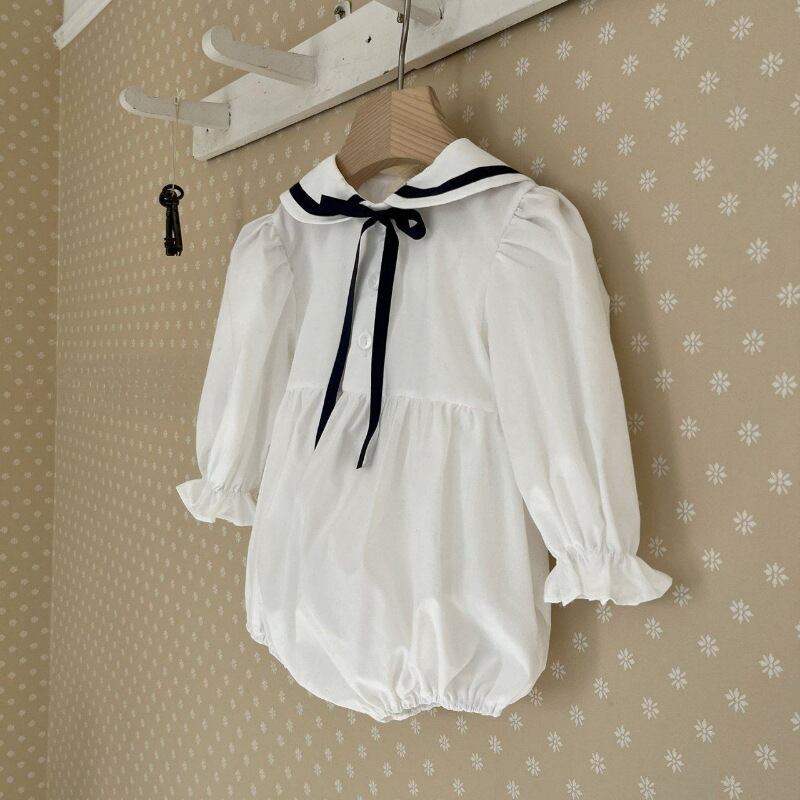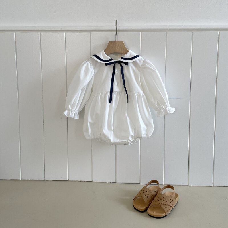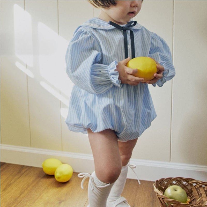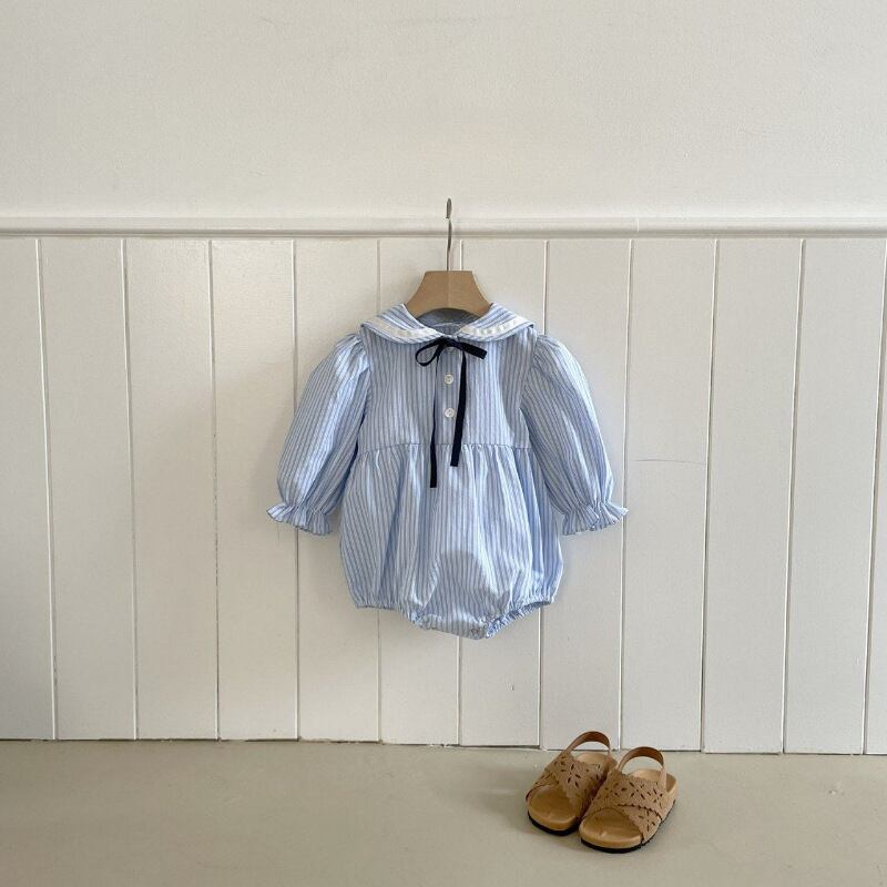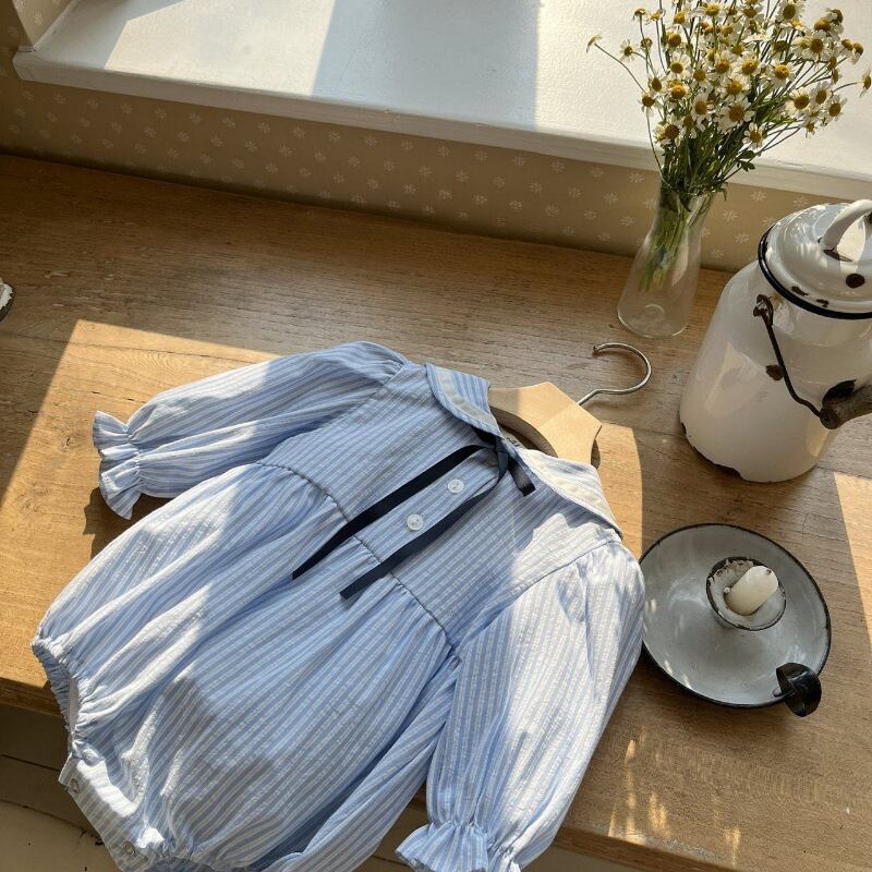 ベビー 春新作 韓国風 ストライプ リボン 襟付き ロンパース