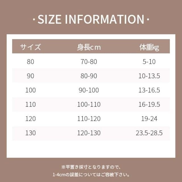 サイズ展開:80,90,100,110,120,130 カラー:クリーム,ブラウン <ご注文前に必ずご利用ガイド/SHOPPING GUIDEをお読みください> 〇当店は海外に在庫があり、在庫の変動が激しいため、商品を発送するまで5~14営業日ほど頂いております。お時間に余裕をもってご注文下さい。ご注文が集中した場合や、発送業務または海外の祝休日の都合により発送が遅れることもございます。予めご了承下さい。 〇ご注文後のキャンセルと変更、発送後のご返品およびご交換は承りかねます。(商品不良の場合を除く) 〇表示されているサイズの一部は売り切れて入荷がない場合もございます。入荷の有無についてはお問い合わせいただいても回答出来かねますので、ご了承ください。 〇同じ商品でも色によって定価販売と割引価格販売が混在する場合があります。 〇照明の関係により、実際よりも色味が違って見える場合があります。 またパソコン、スマートフォンなどの環境により、若干製品と画像のカラーが異なる場合もございます。予めご了承ください。 〇商品画像はサンプルのため、色味やサイズ等の仕様に変更がある場合がございますので、予めご了承ください。 〇衣類は全て平台に平置きし外寸を測定しております。商品によってはどうしても若干の誤差が発生してしまいます。予めご了承ください。 ご注文金額7,000円(税込)以上お買上げで送料無料となります。 ※一部例外もございますのでご注意下さい。 沖縄のお客様は7,000円(税込)以上お買い上げの場合、別途配送料金が発生するため、下記リンクまで「追加送料」をご注文お願い致します。 注文しない場合は発送できかねますので、予めご了承ください。 https://momokids.official.ec/categories/4720971 SNSフォローはこちら: ins:momokids_official ショッピングアプリ【PayID(旧BASE)】フォロワーリンク: https://thebase.in/to_app?s=shop&shop_id=momokids-official-ec&follow=true