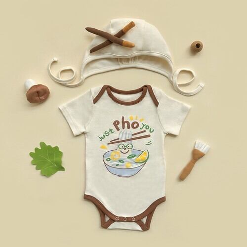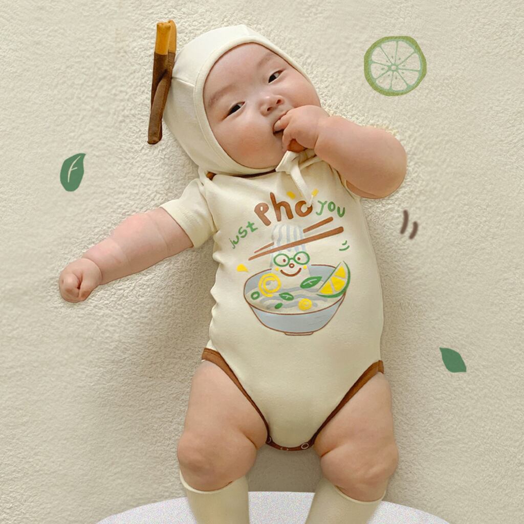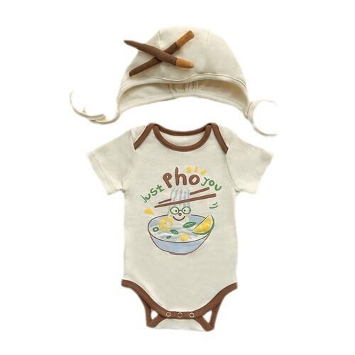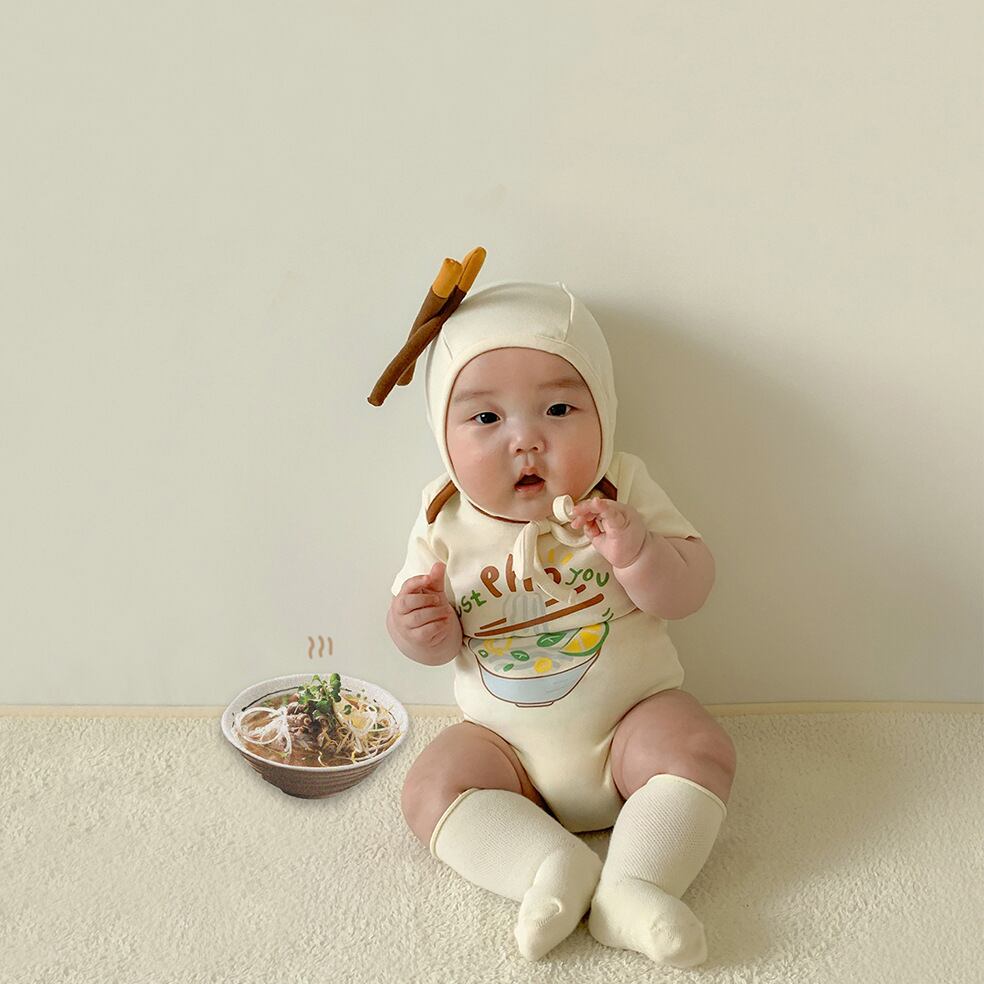 ベビー 夏新作 韓国風 ヌードルプリント ロンパース ボンネット付き