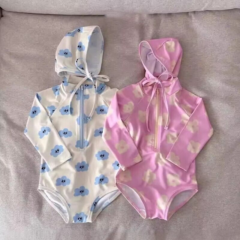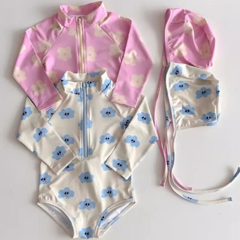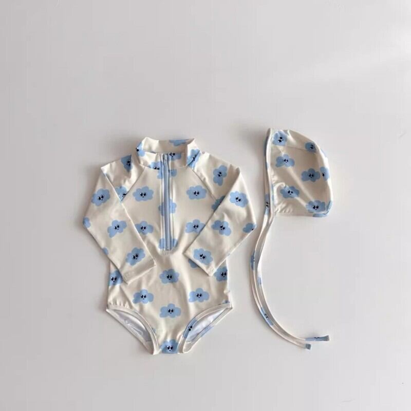 ベビー 夏新作 韓国風 女の子 長袖 雲と小花モチーフ キャップ付き 水着 セット